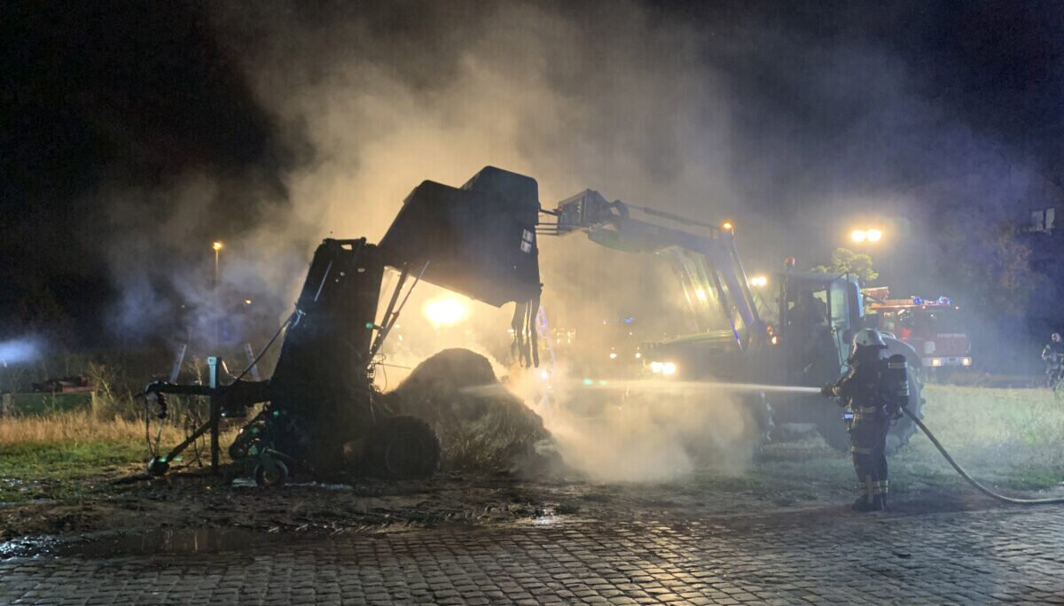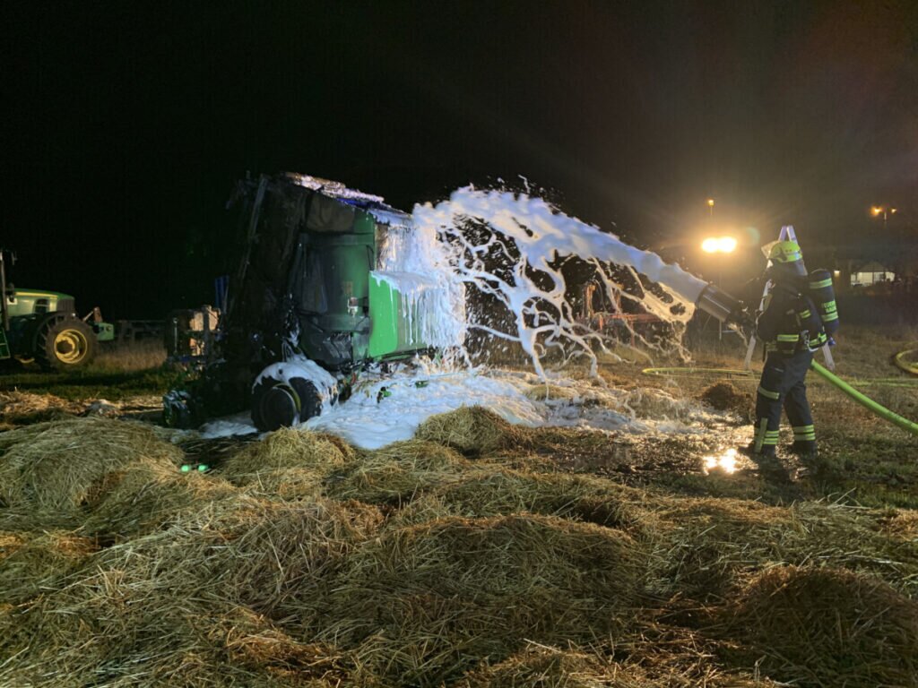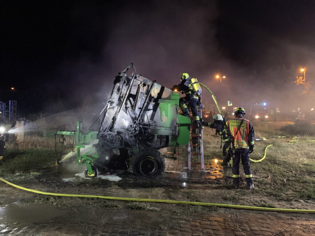 Beim Eintreffen des Einsatzleiters wurde eine Strohballenpresse im Vollbrand vorgefunden. Diese war noch an die Zugmaschine, einen Traktor, angekuppelt. Durch den Einsatz mehrerer Handfeuerlöscher, konnte das Feuer bis zum Eintreffen des ersten Löschfahrzeugs auf die Ballenpresse begrenzt werden.