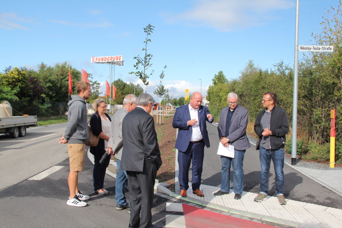 „Wir können stolz sein auf das, was hier entstanden ist und noch entsteht“, betonte Bürgermeister Kretschmann. Es wurden circa 400 Meter Straße mit Gehweg, Straßenbegleitgrün und Parkstreifen inklusive Straßenbeleuchtung gebaut sowie Entwässerungskanäle und Versorgungs- und Telekommunikationsleitungen gelegt. Vorsorglich auch verlegt wurden darüber hinaus Leerrohre. „Das macht die Stadt grundsätzlich bei jedem Bauprojekt, egal ob Wohngebiet oder Gewerbegebiet. Denn wir wissen nicht, was in Zukunft eventuell noch benötigt wird. Vor 60 Jahren hat man auch gedacht, nach Kupferkabeln braucht man nichts anderes mehr.“ Die neuen Straßenlaternen haben energiesparende LED-Leuchten, die vom Bürgersteig aus per Bluetooth steuerbar sind.