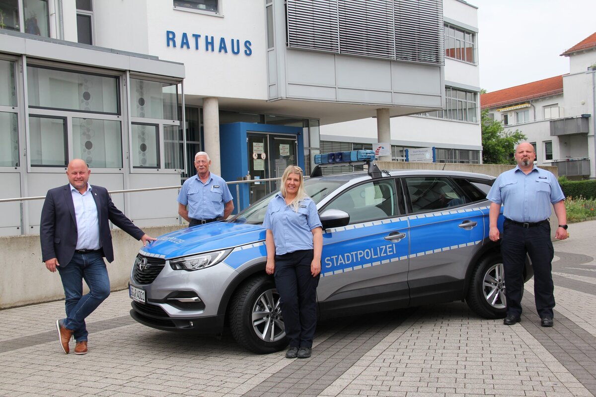 Riedstadt – Aus Ordnungspolizei wird Stadtpolizei: Nach dem Bestreben des Magistrats ist es zu einer Umbenennung der kommunalen Hilfspolizeibeamten gekommen: Kristina Schikor-Rothenhäuser, Manfred Jäger und Uwe Gremm tragen nun die Bezeichnung „Stadtpolizeibeamte“. Sichtbarster Ausdruck der Umbenennung ist der neue Einsatzwagen des Trios, den Bürgermeister Marcus Kretschmann nun übergeben konnte: Auf der Front und den Seiten prangt unübersehbar der Schriftzug „Stadtpolizei“.