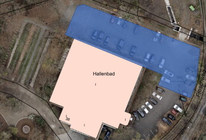 Ein Teil des Parkplatzes (der auf dem Foto blau markierte Bereich) ist ausschließlich Badegästen des Woog-Inselbades vorbehalten. Das Abstellen von Fahrzeugen durch Anwohnerinnen und Anwohner bzw. Nichtbadegäste ist verboten.