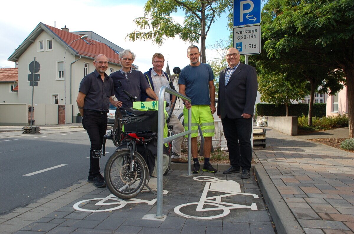 Fahrradparkplätze sind häufig zu eng oder auch zu kurz für die Lastenräder, die mit ihrem Transportvorbau ein gutes Stück länger sind als normale Fahrräder. In Jugenheim hat die Gemeindeverwaltung jetzt in der Hauptstraße schräg gegenüber vom Kreiskrankenhaus einen PKW-Parkstand zu einem Parkplatz für zwei Lastenräder umgebaut. Beratend unterstützt hat das Projekt Xavier Marc vom ADFC Darmstadt-Dieburg. Weitere solcher Lastenfahrradparkplätze sollen nach und nach in der Gemeinde folgen. Ein positiver Begleitumstand in der Hauptstraße: Die LKWs haben vom benachbarten Supermarktparkplatz nun eine bessere Ausfahrt.