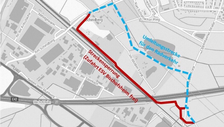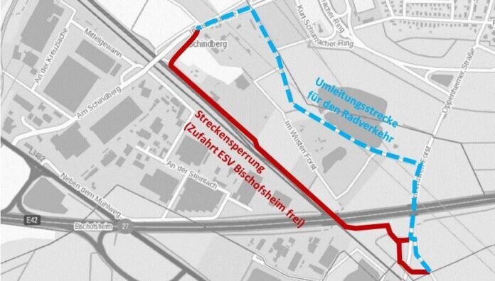 KREIS GROSS-GERAU – Aufgrund von Bauarbeiten ist die Kreisradroute 29 auf einem rund ein Kilometer langen Abschnitt zwischen der Industriestraße in Bischofsheim und der Oppenheimer Straße in Rüsselsheim ab dem 8. März 2023 bis voraussichtlich Ende März gesperrt. Die Zufahrt zum Vereinsgelände des ESV Blau Gold Bischofsheim e.V. aus Richtung Industriestraße ist weiterhin gewährleistet. Während der Bauzeit ist eine Umleitungsstrecke für den Radverkehr ausgeschildert.