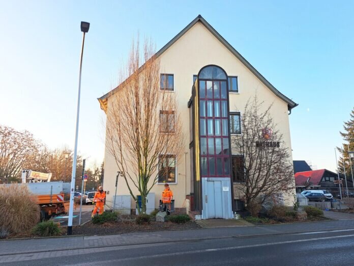 Als Vorbereitung für den Aufzugsneubau müssen zwei sich direkt am alten Aufzug befindliche Bäume weichen. Die Mitarbeiter*innen des städtischen Bauhofs, Petra Massing und Avni Miftaraj, haben am Montag (13. Februar) in einem ersten Schritt die Hainbuche gefällt. Der rechts vom Aufzug gewachsene Eisenholzbaum folgt ebenfalls noch im Februar, bevor die Brut- und Nistzeit der Vögel beginnt. Ersatzpflanzungen sind an gleicher Stelle nach Abschluss der Rathaus-Sanierung vorgesehen.