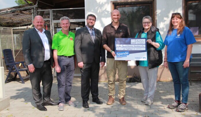 Der Riedstädter Christian Heinze kam gemeinsam mit Riedstadts Bürgermeister Marcus Kretschmann, Kulturbüroleiter Marco Hardy und dem Vorsitzenden des TV Erfelden, Thomas Pöschl, in das Tierheim und überreichte einen symbolischen Scheck in Höhe von 1.100 Euro.