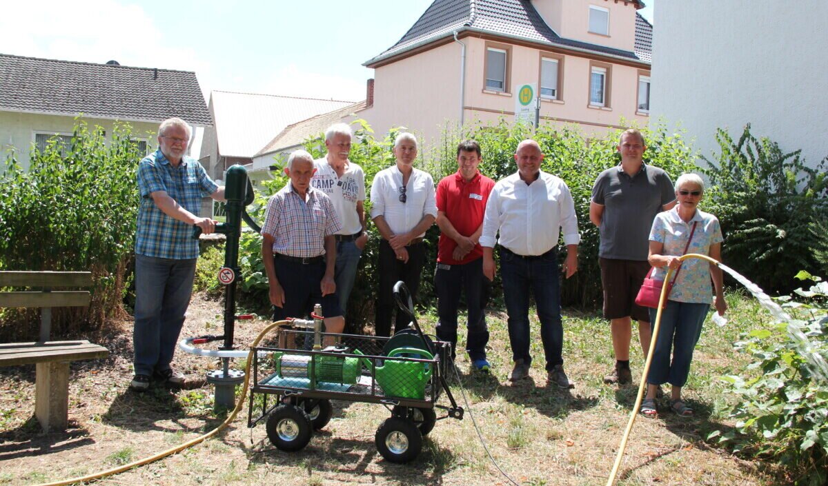 Über die neue Bewässerung freuen sich Werner Friedrich, Wilfried Wiesenäcker, Robert Jungert, Matthias Harnisch von der Fachgruppe Umwelt, Björn Melchior, Bürgermeister Marcus Kretschmann, Mario Friedrich und Renate Freudenberger (von links). Foto: Stadt Riedstadt