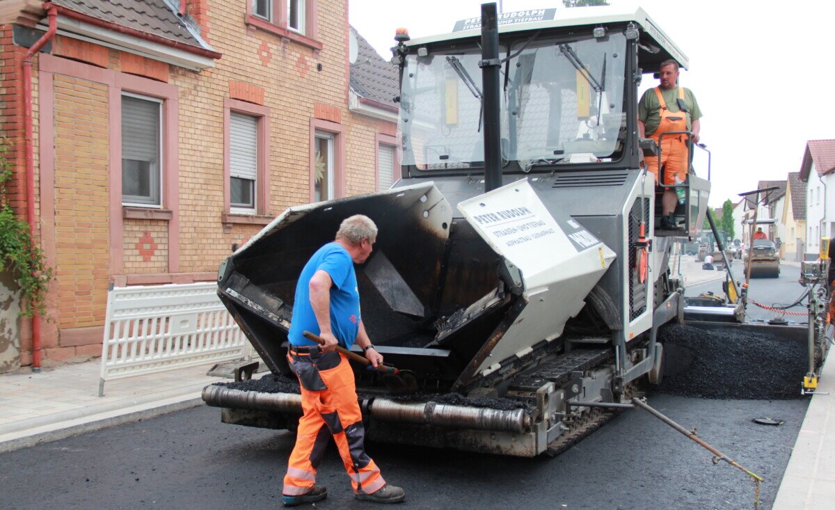 RIEDSTADT – Auf dem Teilstück der Bahnhofstraße mit dem Übergang zur Bahnhofsallee herrscht geschäftiges Treiben: In regelmäßigen Abständen fließt aus einem Lkw 163 Grad heißes Material für die Binderschicht der Straße in den Asphaltfertiger, der es gleichmäßig auf der Straße verteilt. Anschließend fährt eine Walze auf den frisch aufgebrachten Asphalt und verdichtet ihn. Schließlich legen zwei Männer eine Troxler-Sonde auf die Straße und schreiben nach der Messung eine „98“ auf die Oberfläche.