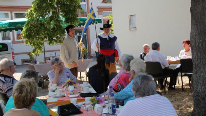 Außerdem gab es sogar noch königlichen Besuch: Schwedenkönig Gustav Adolf – in Gestalt des Erfelder Heimatmuseumsleiters Alexander Reichard – zog in voller Montur mitsamt seinem „Knappen“ Hans Kopp, Vorsitzender des Erfelder Heimat- und Museumsvereins vor die Gästeschar und erzählte gut gelaunt ein wenig von seiner Rheinüberquerung im Dreißigjährigen Krieg.