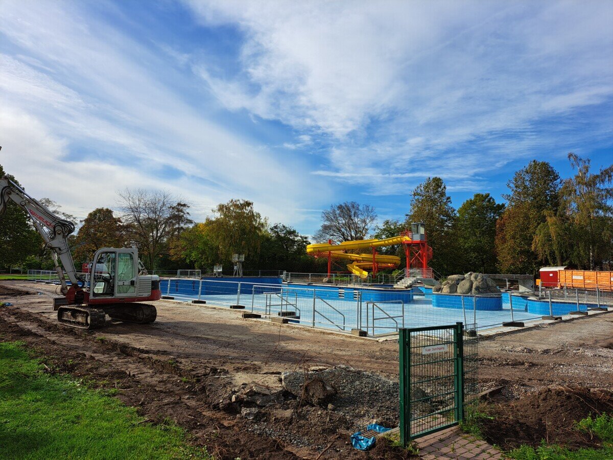 Daher werden die Beckenumgänge nun von einer Fachfirma zunächst umfangreich abgebrochen, bevor sie dann im Anschluss vollständig neu aufgebaut und die Fliesen in diesem Bereich durch widerstandsfähige Pflastersteine auf einer Schotterunterlage ersetzt werden. Rund 1.360 Quadratmeter Fläche sind von der Maßnahme betroffen. Parallel dazu erfolgen die Abdichtungs-, Putz- sowie Fliesenarbeiten im Mehrzweck- und im Kinderplanschbecken mit anschließenden Nachverfugungen der Beckenböden und der Wände. In diesem Zusammenhang werden auch die Rinnenroste an beiden Becken erneuert.