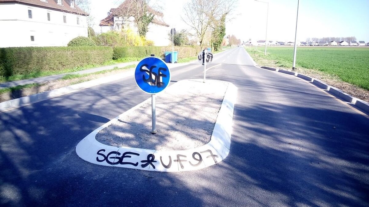 Solche Schmierereien wie hier auf einer Verkehrsinsel finden sich in Crumstadt und Philippshospital häufig. Foto: Stadt Riedstadt