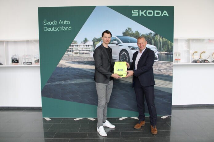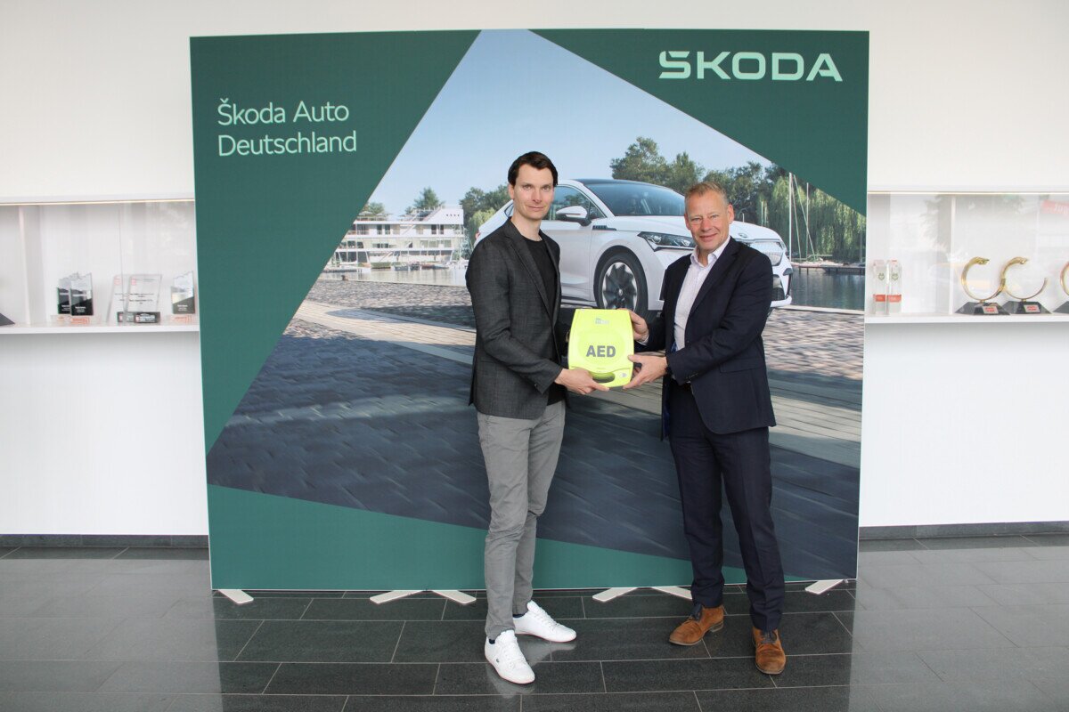 WEITERSTADT – Am Sportplatz Gräfenhausen ist seit kurzem ein neuer Defibrillator angebracht. Es handelt sich hierbei um eine Spende von Škoda Deutschland. Brügermeister Ralf Möller nahm das großzügige am vergangenen Mittwoch stellvertretend vom Sprecher der Geschäftsführung von Škoda Auto Deutschland, Jan-Hendrik Hülsmann, entgegen.