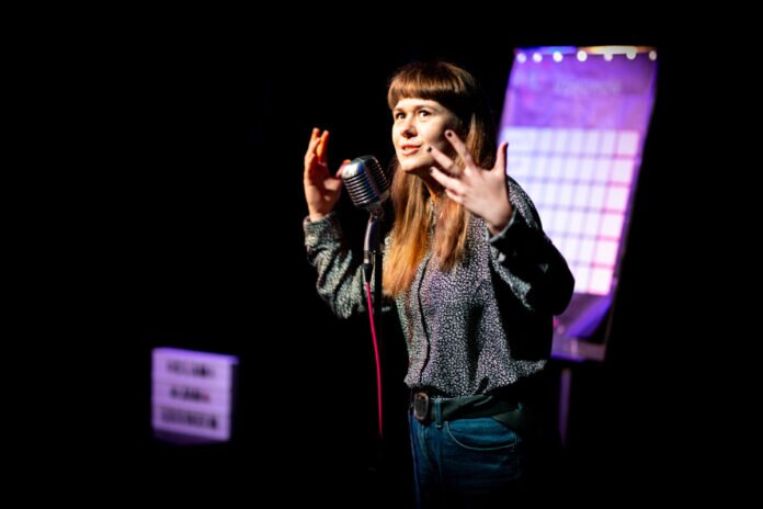Laura Palys aus Frankfurt beim Poetry Slam in Leeheim; SLAM JAM - Die Poetry-Slam-Veranstaltungsreihe im Kreis Gross-Gerau - Veranstaltung am 13. April 2023 in der BuechnerBuehne in Riedstadt-Leeheim (Hessen). Foto: Raphael Schmitt / slam-jam.de