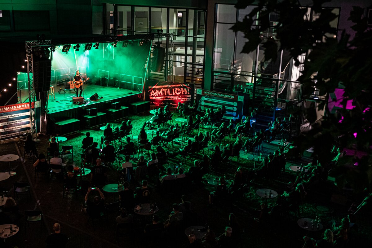 Und die Fans wurden nicht enttäuscht. Das 40-jährige Bandjubiläum feierte Sullivan nach den coronabedingten Absagen der Tourneen nun in einem sehr intimen Rahmen. 150 Gäste hatten auf dem Freilichtgelände zwischen Foyer und Cafeteria Platz, verteilt auf kleine Tische. Wer seinen Stuhl verließ, musste Mundschutz tragen. Das Umfeld stimmte: Pünktlich zur Eröffnung kam die Sonne hervor. Entspannt lauschten die Gäste dem Gitarristen und Songschreiber Guiseppe Porrello alias Gastone. Der „Frankfurter Bub“ überzeugte mit Balladen, sozialkritischen Texten, Liebensliedern.