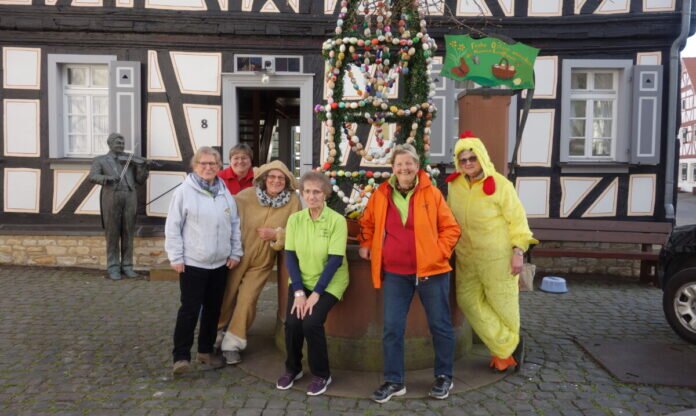Nachdem einige Mitglieder schon am Samstag die Depot Eier, keine Plastikeier an der Osterkrone aufgefädelt hatten, wurde das Schmuckstück am Sonntagvormittag auf dem Brunnen platziert. Pünktlich eröffnete der Nauheimer Osterhas alias Anne Dammel das Traditionsfest.
