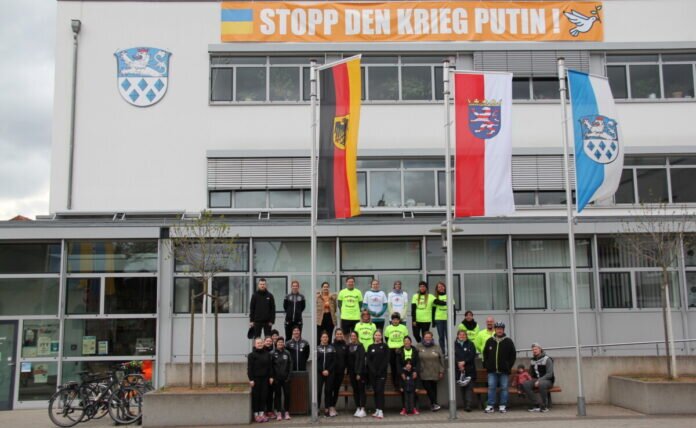 Unter diesem Banner versammelten sich am Mittwochabend rund 30 Beschäftigte der Büchnerstadt Riedstadt, um unter dem Motto „Laufen, walken, radeln für Frieden, Freiheit und Demokratie. Stopp den Krieg, Putin!“ Spenden für die Menschen in der Ukraine zu sammeln.