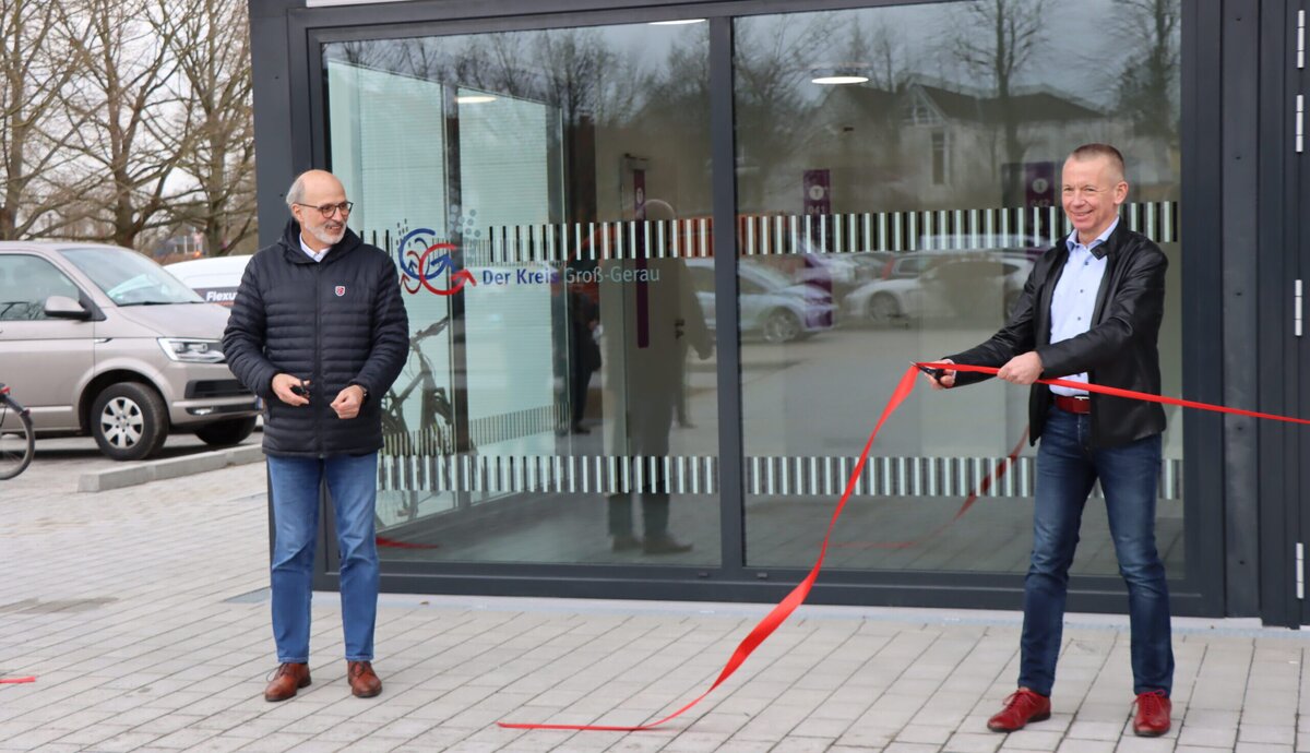 Groß-Geraus Bürgermeister Erhard Walther (links) und Landrat Thomas Will weihten die Kreissporthalle 2 am Mittwoch gemeinsam ein. Foto: Kreisverwaltung