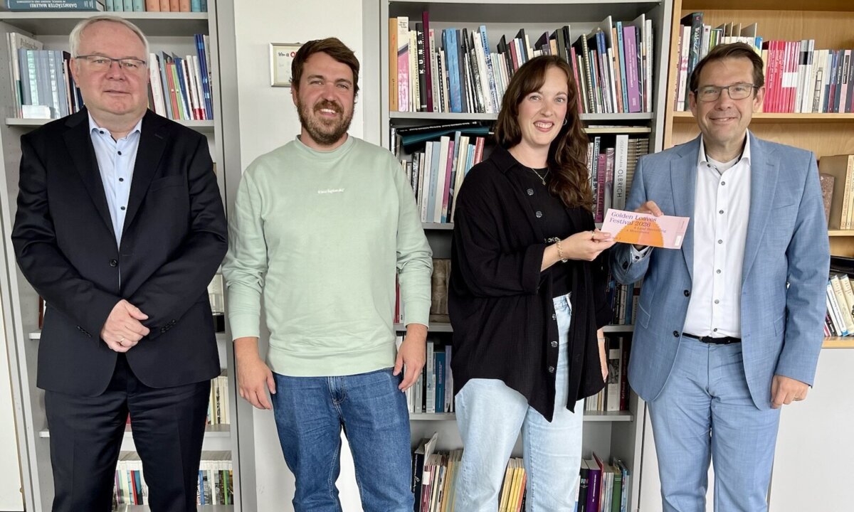 Stadtkämmerer André Schellenberg, Dominik Schmidt, Eva Marggraf und OB Hanno Benz (v.l.n.r.) bei der Übergabe des Tickets Nr. 1 für 2026 / Quelle: Wissenschaftsstadt Darmstadt – Daniel Klose