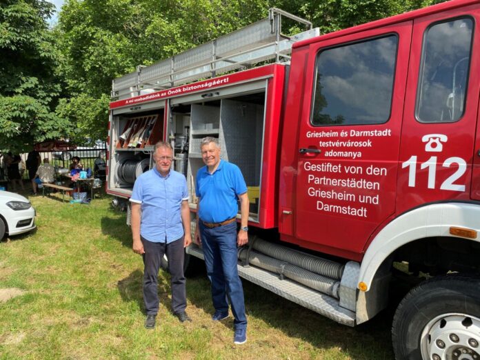 Anschließend fand der Besuch des Pfingstfestes statt, bei dem viele Volkstänze in der Tradition der Donauschwaben gezeigt wurden. Zusätzlich gab es ein Wiedersehen mit einem Löschfahrzeug, dass die Stadt Griesheim gemeinsam mit der Stadt Darmstadt 2019 der Freiwilligen Feuerwehr in Gyönk gebraucht gestiftet hatte. Es war in Griesheim ausgemustert worden, war aber noch voll funktionstüchtig und leistet seither in Gyönk wertvolle Hilfe.