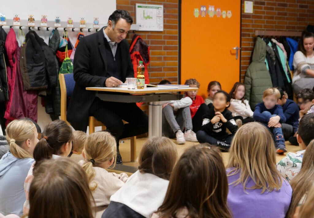 Neugierig waren die Drittklässler*innen auch gut zehn Kilometer entfernt in der Grundschule Königstädten. Dort war der neue Erste Kreisbeigeordnete Adil Oyan zu Gast, um vor gut 100 Kindern aus dem Buch „Teppichpiloten“ des Kinderbuchautors Knister (der mit bürgerlichen Namen Ludger Jochmann heißt) zu lesen. Doch bevor er von Jakobs Geburtstagsgeschenk berichten konnten, einer sagenhaften Nacht mit Opa im Museum, stellte sich Oyan in einer munteren Plauderrunde den Fragen der Kinder: Alter, Haustier, Sternzeichen, Hobbys, Lieblingsbuch, Arbeitsplatz, Fremdsprachen. Und dann griff er zum Buch.