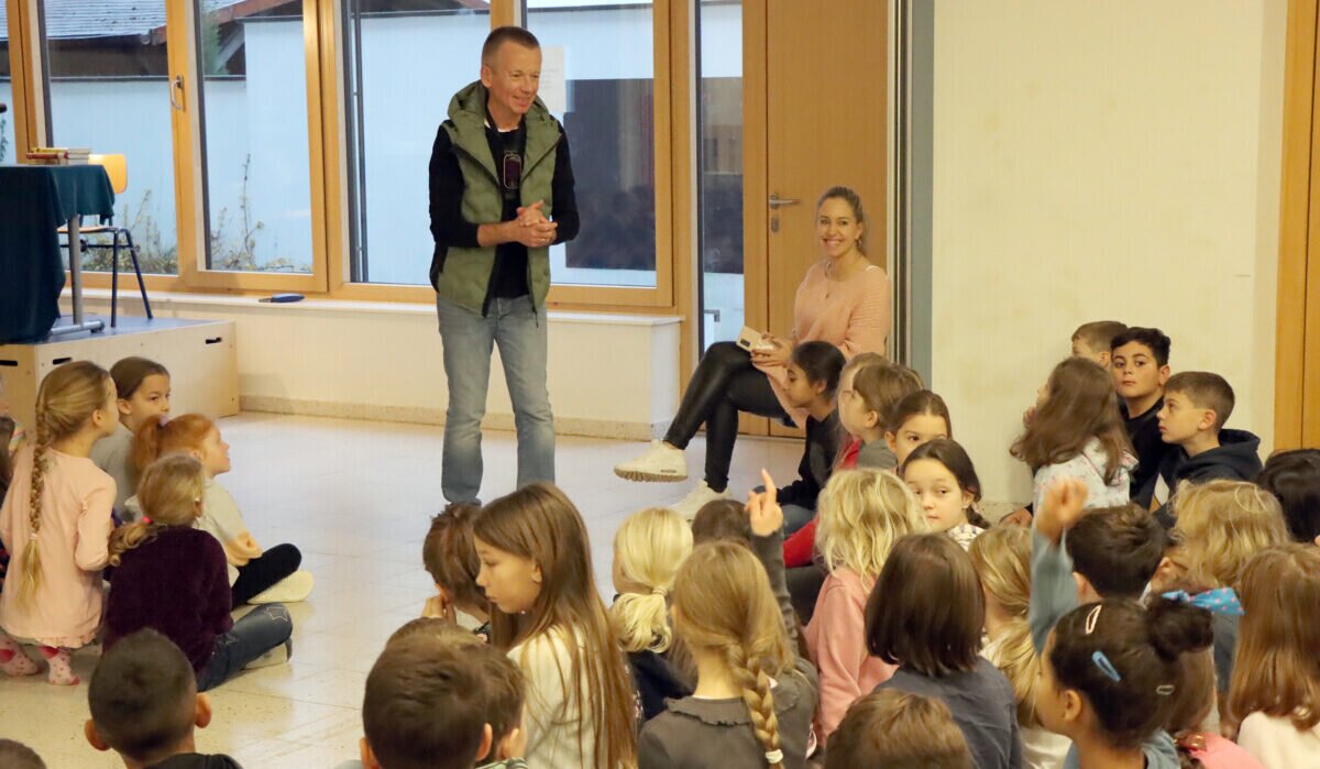 KREIS GROSS-GERAU – Montagmorgen, kurz vor 8 Uhr: Die Aula der Pestalozzischule in Büttelborn füllt sich nach und nach mit Schülerinnen und Schülern, die sich auf Sitzklötzen und auf dem Fußboden niederlassen. Eine Lehrerin stimmt ein paar Töne auf dem Klavier an – und schon singen alle gemeinsam ein Lied und vertreiben sich die Zeit, bis Landrat Thomas Will eintrifft.