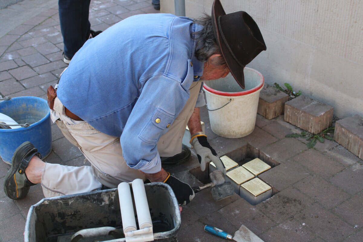 WEITERSTADT – Der Künstler Gunter Demnig verlegte am Dienstag, 14. Mai 2024 in der Mittelstraße 1 und in der Mittelstraße 14 im Weiterstädter Stadtteil Gräfenhausen Stolpersteine zur Erinnerung an die jüdischen Familien Strauß und Seliger.