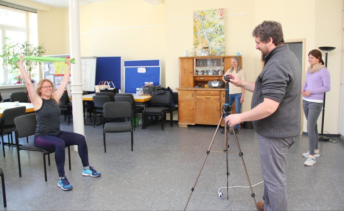 Schritt für Schritt macht Stahlecker vor, wie alle gemeinsam sich lockern und bewegen können – ganz so, als wären Übungsleiterin und TeilnehmerInnen wie sonst üblich im Raum versammelt. Und auch der Trinkspruch mit Teebecher am Ende des Gruppentreffs ist das gewohnte Abschiedsritual: „Aufschwung, Vorschwung, Rückschwung, Umschwung – Kibbe!“, sagt Stahlecker und bewegt den Becher gemäß Spruch.