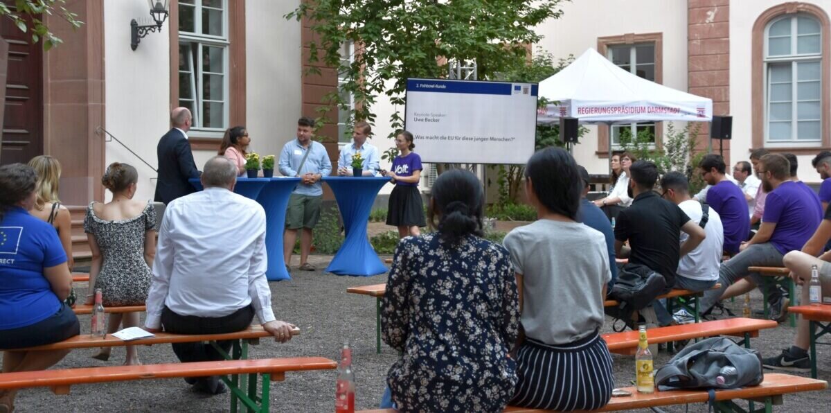 DARMSTADT – Eine heiße Sommernacht, 50 Europa-Begeisterte und jede Menge kluge Köpfe – das waren die Erfolgszutaten für eine lebhafte, interaktive Fishbowl-Diskussion am Montagabend im stimmungsvollen, frisch renovierten Innenhof des Regierungspräsidiums (RP), Sitz des Europe Direct Darmstadt. Musikalisch eingerahmt vom DJ-Duo „Disco Sour“, sowie bestens versorgt mit Snacks und kalten Getränken, ging es gut zwei Stunden lang um das TRAUMZIEL EUROPA und darum, was junge Leute an Europa schätzen.