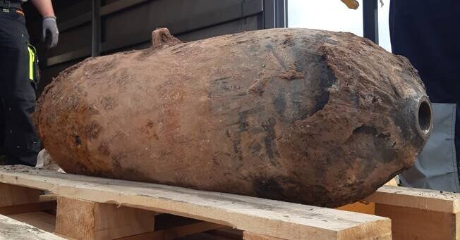 Der 250-Kilo-Blindgänger nach der erfolgreichen Entschärfung der Zünder. © RP Darmstadt