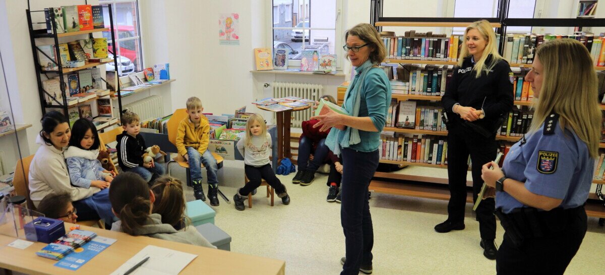 RIEDSTADT – Zu einer ungewöhnlichen Vorlesestunde hatte kürzlich die Leiterin der städtischen Bücherei Anja Stark in die Bücherei Leeheim eingeladen: Gemeinsam mit den beiden Schutzfrauen vor Ort Katja Vagi-Mager und Caroline Fernandez gingen die begeisterten Kinder auf Verbrecherjagd.