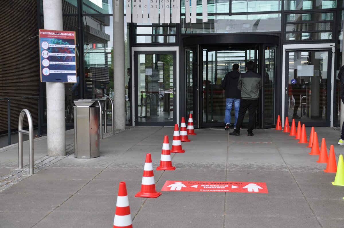 Die Kreisverwaltung hat sich in vielerlei Hinsicht auf die steigende Zahl von Besuchen durch die Kundschaft vorbereitet. So wurden bereits am Eingang Wege und Warteabschnitte markiert, damit sich die Menschen an den wegen Corona nötigen Abstand halten können. Es hängen Spender mit Händedesinfektionsmittel in den Fluren. Zudem gilt für die Besucher*innen eine Maskenpflicht im Landratsamt.
