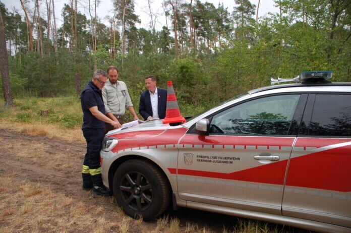 Getroffen haben sich der Bürgermeister, der Gemeindebrandinspektor und der Revierförster an einer besonders gefährdeten Stelle im Gemeindewald: im Naturschutzgebiet Kalksandkiefernwald zwischen Seeheim und Malchen, wo fast ausschließlich Nadelbäume stehen. „Durch den hohen Harzanteil der Kiefern ist die Brandgefahr hier sehr hoch, anders als in einem Mischwald“, erklärt Dirk Hungenberg. Überall im Waldgebiet sind die Pflanzen an den Wegen vertrocknet. „Das brennt wie Zunder“, warnt Stefan Katzer. „Schon ein Funke reicht aus, um hier alles in Brand zu setzen.“ Die meisten Waldbrände werden durchs Rauchen verursacht, aber auch ein Grill, ein Lagerfeuer, Glasscherben oder ein heißes Auto, das auf trockenem Bodenbewuchs parkt, können Brände auslösen. Wer einen Waldbrand oder Rauchentwicklung bemerkt, sollte umgehend die Feuerwehr unter dem Notruf 112 verständigen. Damit der Einsatzort schnell von den Rettungskräften gefunden werden kann, empfehlen Revierförster und Gemeindebrandinspektor die App „Hilfe im Wald“, die auch den nächstgelegenen Rettungspunkt zur Orientierung anzeigt. Waldeinfahrten sowie Wege im Wald müssen immer für die Einsatzfahrzeuge freibleiben und dürfen nicht zum Parken von PKWs genutzt werden. Mit auf dem Boden liegenden Leitkegeln markieren die Rettungskräfte die Strecke zum Einsatzort. „Wir bitten Spaziergänger, die solche Kegel sehen, diese nicht aufzustellen oder ihre Position zu verändern“, so Bürgermeister Alexander Kreissl. „Sie sind wichtige Hilfsmittel für die Feuerwehrleute, um sich im Wald zurechtzufinden und schnell an die brennende Stelle zu kommen.“ Mit Sorge nehmen alle Drei die Dürre und die damit bestehende Waldbrandgefahr wahr und hoffen darauf, dass durch ihre gemeinschaftliche Mahnung an die Waldbesucher, die Warnhinweise zu beachten und alle Feuerquellen zu vermeiden, erst gar kein Brand entsteht.