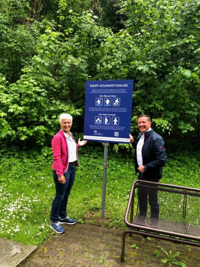 Kreislauf und Immunsystem stärken, Durchblutung fördern und Venen kräftigen: All das gehört zu den positiven Effekten, die mit der wohl bekanntesten Anwendung des Naturheilkundlers Sebastian Kneipp verbunden sind. Damit Wanderer oder gesundheitsbewusste Bürger erfahren, wie sie richtig „kneippen“ und sich mit dem Wassertreten und dem Armbad rundum fit halten können, hat die in Seeheim lebende Osteopathin Prof. Marina Fuhrmann der Gemeinde ein neues Übersichtsschild gespendet. Denn auf dem alten Schild wurde nur das Wassertreten erklärt und nicht die „Tasse Kaffee der Naturheilkunde“, wie das kalte Armbad auch genannt wird. Der Muntermacher wirkt ausgleichend und anregend zugleich, morgens oder am frühen Nachmittag angewendet vertreibt er Müdigkeit und Erschöpfung. „Kneippen richtig angewandt hat einen positiven Einfluss auf das vegetative Nervensystem und somit auf alle Körperfunktionen. Daher hat es mich sehr gefreut, dass ich einen kleinen Beitrag zur besseren Verdeutlichung der Kneippschen Anwendungen beitragen konnte“, so Marina Fuhrmann.