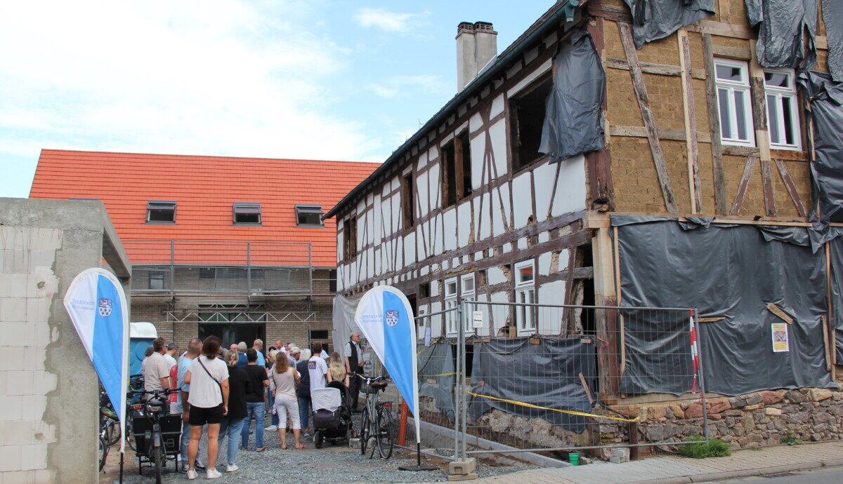 Bevor die vielen interessierten Menschen Hof und Gebäude besichtigten, gab Hartmann einen Überblick über das Wohnprojekt: Das Fachwerkhaus aus dem 17. Jahrhundert wird unter den Vorgaben des Denkmalschutzes aufwendig saniert. Entdeckt wurde bei den Sanierungsarbeiten eine seltene „Kölner Decke“, die bei dem Besichtigungstermin noch zu sehen war, später aber zu ihrem Schutz unter einer abgehängten Decke verschwinden muss. Das Fachwerk zur Hofseite hin muss an so vielen Stellen erneuert werden, dass es noch verputzt werden wird.