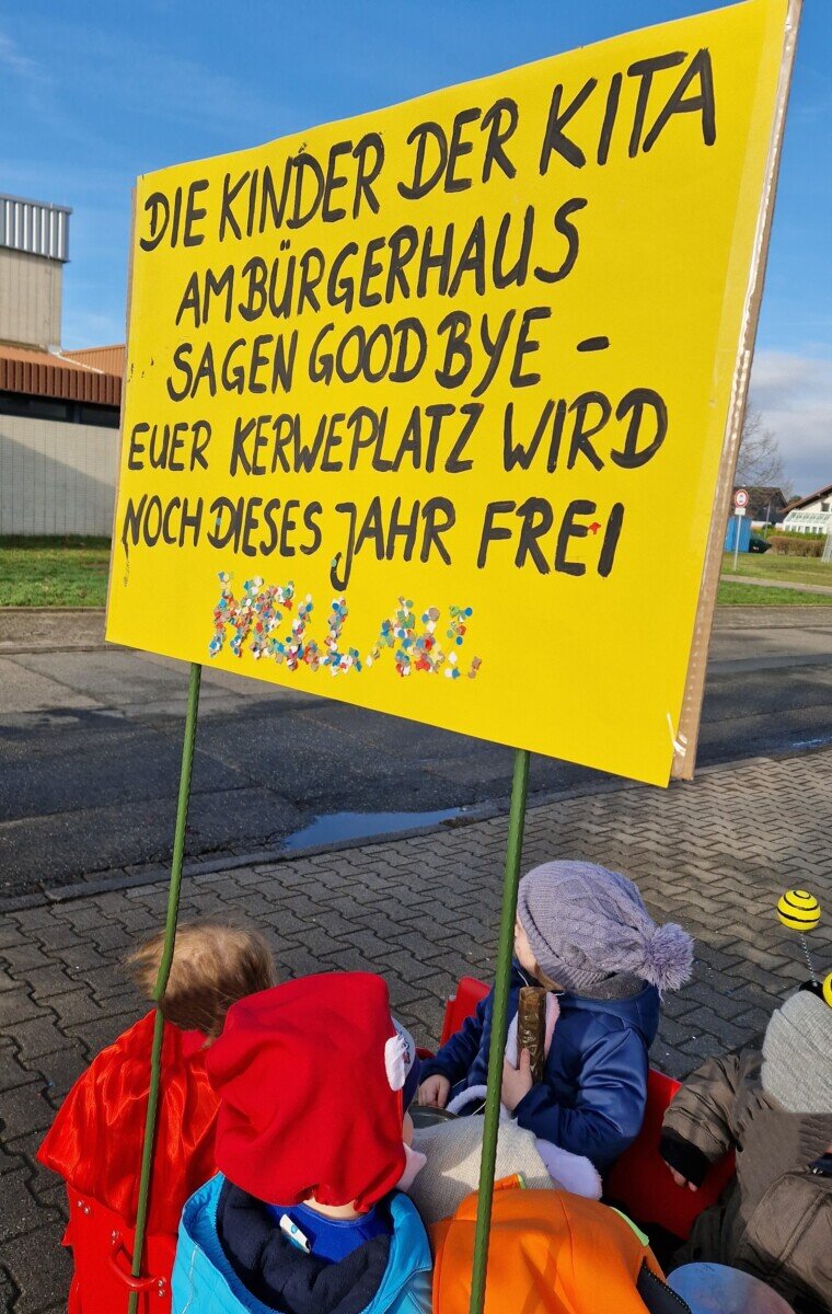 Zuschauer kamen aus den Häusern, winkten und riefen „Helau“, Autofahrer hupten und freuten sich an dem bunten Treiben. Besonders gefeiert wurde ein selbst gebasteltes Schild, das durch die Straßen getragen wurde und auf dem in großen Buchstaben stand: „Die Kinder der Kita am Bürgerhaus sagen Good Bye – euer Kerweplatz wird noch dieses Jahr frei“. Das gab viel Applaus und zustimmendes Gelächter.