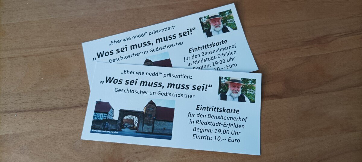 Unter dem Titel „Wos sei muss, muss sei“ präsentieren fünf Ensemblemitglieder des Theaters „Geschidscher un Gedischdscher“ in südhessischer Mundart. Albernes, manchmal auch Besinnliches – auf jeden Fall aber viel Amüsantes wird zu hören sein. Zwei Biebesheimer Musikanten begleiten die Lesung mit Volksliedern. Die Moderation des Abends übernimmt der Vereinsvorsitzende und Mundart-Pfarrer Walter Ullrich.