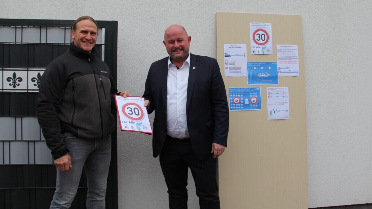 RIEDSTADT – Ein großes Tempo-30-Schild mit dem Hinweis „Für alle“ und den Stichworten „mehr Sicherheit“, „weniger Lärm“, „weniger Gebäude- und Straßenschäden“, „mehr Lebensqualität, ist neben weiteren Plakaten mit Schaubildern auf der Stellwand im Hof des Anwesens von Andreas Liebmann in der Wilhelm-Leuschner-Straße abgebildet. Es prangt auch auf der Unterschriftenmappe, die Liebmann bei einem Ortstermin in Anwesenheit einiger Nachbarn Bürgermeister Marcus Kretschmann überreichte.